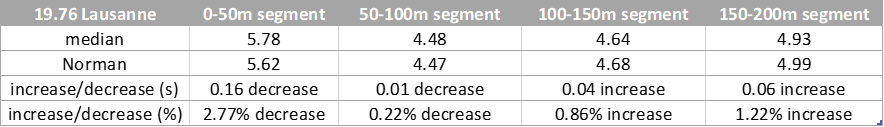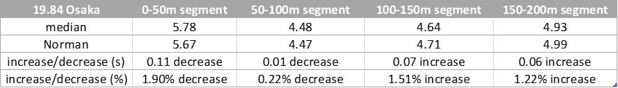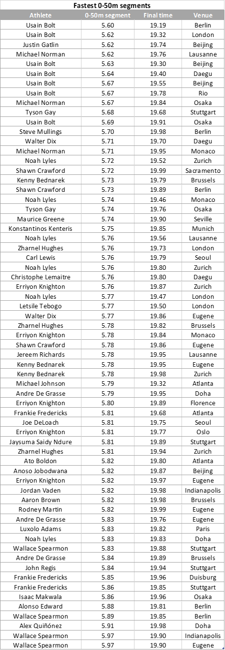 Noah Lyles is the only other sprinter that has managed to run faster than the median during every 50m segment more than once. Lyles has probably done that five times (we know that he has done it at least four times and he most likely also did it in his 19.31 performance) which is one more than even Usain Bolt who had four such performances. It did surprise me that his first 50m segment in the 19.56 performance was as fast as 5.76 considering how he got left in the blocks by Michael Norman. But when we consider that Norman had one of the greatest first 50 metres of all time in that race it may be a case of that the great start of Norman made Lyles start seem slower than it actually was.