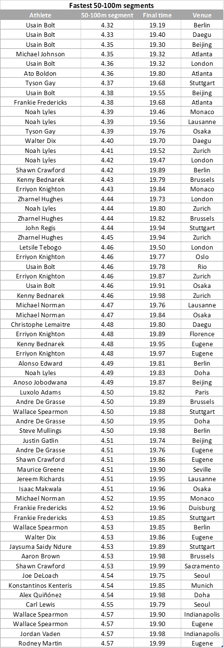 The fastest 50-100m segment in any race longer than 100 metres is the 4.20 split of Tyson Gay in his 19.41 straight track 200m. That means that Gay averaged 0.840s per 10 metres during that 50m segment which is the same average speed that is needed to run the last 40 metres of a 100m race in 3.36. That is something that only very few sprinters in history have managed to do. Gay was in fact not that far off his own fastest last 40 metres of a 100m race (3.31) which gives an average of 0.8275s per 10 metres. With this in mind I think that we can be relatively certain that no one in the near future will run anywhere close to a 4.20 split when being restricted by the curve in a 200m race. Just look at how much slower Usain Bolt ran during the 50-100m segment (4.32, 0.864s per 10m) in his 19.19 compared to his fastest last 40 metres of a 100m race (3.27, 0.8175s per 10m). The difference between the fastest 50-100m segment of Tyson Gay on a curved track (4.37, 0.874s per 10m) and his fastest last 40 metres of a 100m race (3.31, 0.8275s per 10m) is pretty much exactly the same as in the case of Bolt. Both Bolt and Gay were excellent curve runners as well so it is not as if they were more restricted by the curve than most other sprinters. So in order for someone to run a 4.29 split during the 50-100m segment of a 200m race that sprinter will likely have to be able to get something like a 3.24 split over the last 40 metres of a 100m race (0.810s per 10m).