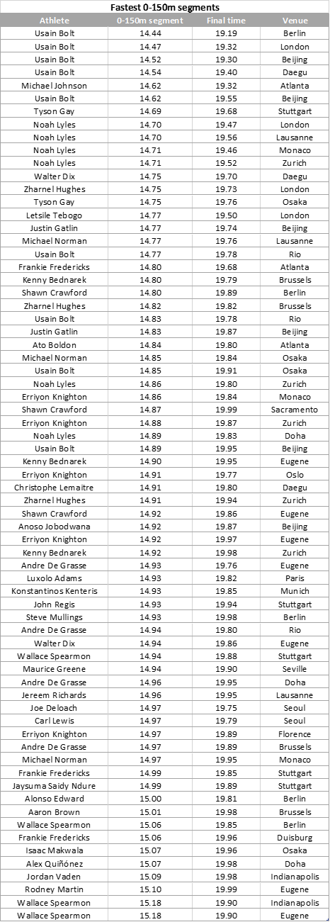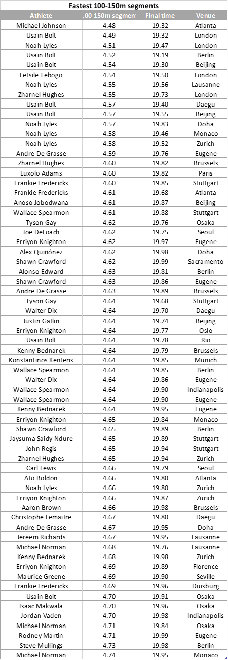 Out of the performances with available 50m splits there has only been four sub-14.6 splits. All of them from Usain Bolt in his four fastest performances. It is possible that Noah Lyles also had a sub-14.6 split in his 19.31. Based on the 10.07+9.24 splits my guess is that the two last 50m splits looked something like 4.51+4.73 or 4.52+4.72 which would put the 150m split of Lyles at 14.58 or 14.59.