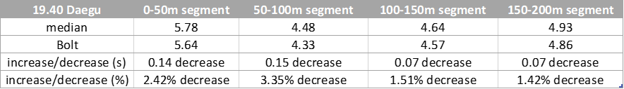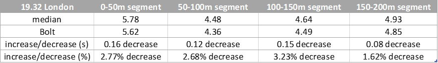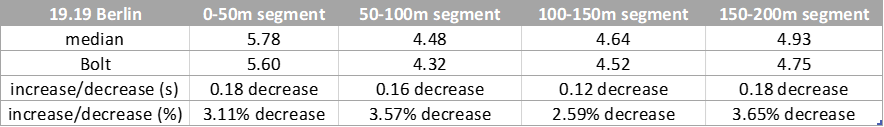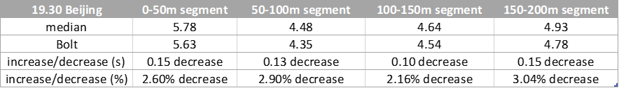 There is however no doubt about that the first two 50m segments are where Bolt excelled the most. The 4.32 split between 50 and 100 metres means that Bolt during that segment averaged 0.864s per 10 metres in spite of being restricted by the curve. However while the 50-100m segment probably was the most impressive I also think that one of the main keys to the 19.19 performance was the first 50m segment and in particular his outstanding start which meant that he was able to run rather relaxed and still pass the 50m mark in 5.60 seconds. Because if we discount the reaction times Bolt actually ran the first 50 metres somewhat slower (5.47) in his 19.19 race than he did in his second, third and fourth fastest races (5.44 in the 19.32 and 5.45 in the 19.30 and 19.40) which suggests that he may have been able to save some energy over the first 50 metres and still end up with an incredible 5.60 split. That slightly more relaxed first 50m segment may also have played a part in that Bolt then managed to run the 50-200m segment significantly faster (13.59) than he did in those other races (13.67 in the 19.30, 13.70 in the 19.32 and 13.76 in the 19.40).