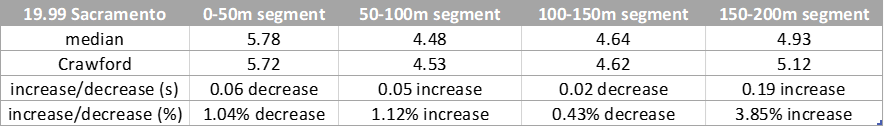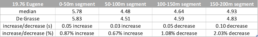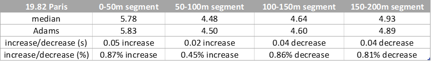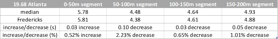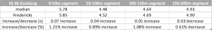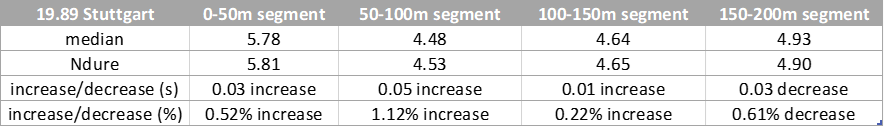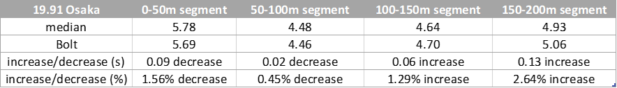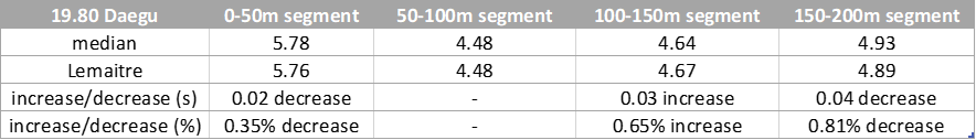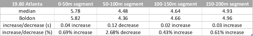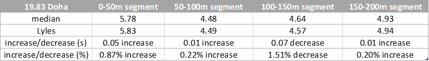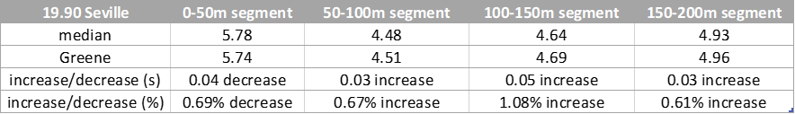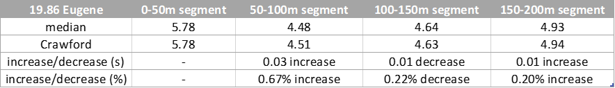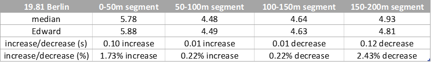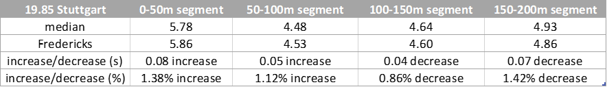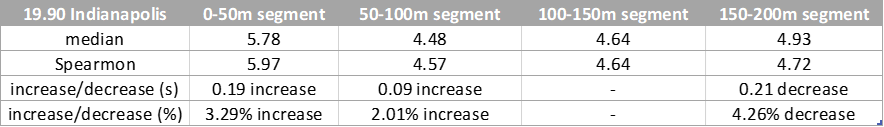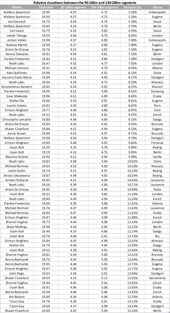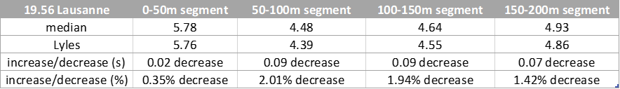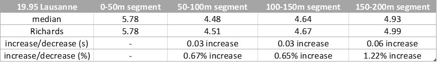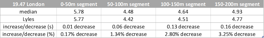 Michael Johnson had a 4.67% decrease compared to the median during the 150-200m segment, a 3.45% decrease during the 100-150m segment and a 2.9% decrease during the 50-100m segment which gives him the fastest 50-200m split of the sprinters in this study (13.53). In the 19.26 race Yohan Blake almost certainly ran the 50-200m segment even faster than Johnson though.