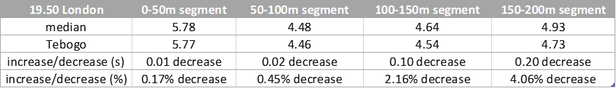 In his 19.50 performance Letsile Tebogo became the third sprinter to run every 50m segment faster than the median result.