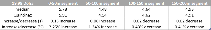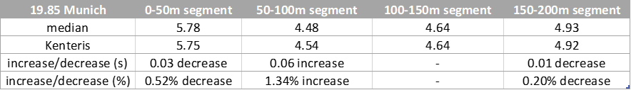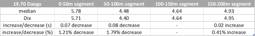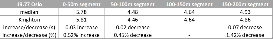 It is also interesting to be able to get a look at how Erriyon Knighton has compared to the median results of each segment. During the three first segments Knighton has performed on a similar level to the overall median result (there was never a bigger difference than 0.05 seconds between Knighton's result and the median of the 0-50m, 50-100m or 100-150m segments). When it comes to the 150-200m segment the results of Knighton has been more spread out on both sides of the median (in his 19.77 Knighton ran the last 50 metres 0.07 seconds faster than the median but in his 19.84, 19.87 and 19.97 he was 0.05, 0.06 and 0.12 seconds slower than the median). Knighton has therefore been rather consistent in his performances over the first 150 metres as he reached that mark in 14.86 (en route to 19.84), 14.88 (en route to 19.87), 14.91 (en route to 19.77), 14.92 (en route to 19.97) and 14.97 (en route to 19.89) and how well he handled the last 50m segment has really been the deciding factor for whether he managed to get a sub-19.8 result or instead ended up with a 19.8 or 19.9. Unfortunately there are only 100m splits from Knighton's outlier result of 19.49 but based on those splits (10.26+9.23) it seems like his first two 50m segments in that race were very similar to his performances in this study and that the difference instead came from significantly faster 100-150m and 150-200m segments.