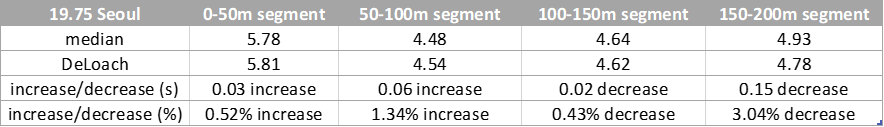 However while I personally believe that the ability to reach a very high top speed during the 50-100m segment may be the most important quality of the truly elite 200m sprinters there are exceptions to that as well. In the Olympic 200m final from 1988 both Joe DeLoach and Carl Lewis are examples of this with both of them having 50-100m splits in the mid-4.5s and still finishing with sub-19.8 clockings. Especially the splits pattern of Lewis is very unique considering that he was faster than the median during the 0-50m and 150-200m segments while he was slower than the median during the 50-100m and 100-150m segments.