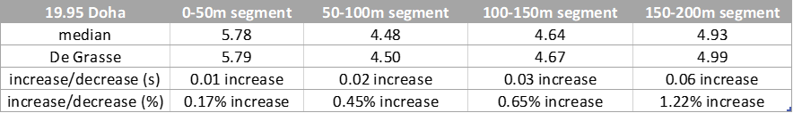 One thing that surprised me is that Andre De Grasse in his 19.95 silver medal performance had his two strongest 50m segments on the curve rather than on the home straight. In the other performances his splits are closer to what I expected with him instead having his strength during the 100-150m and 150-200m segments.