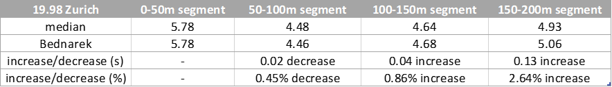 Kenny Bednarek ran a very impressive 10.16 curve during his 19.79 performance where he had 50m splits of 5.73+4.43. Then he matched the median of 4.64 during the 100-150m segment to get to the 150m mark in 14.80. That is as fast a 150m split as Frankie Fredericks had in his 19.68 performance. In the recent 19.67 of Bednarek he passed the 150m mark in 14.79 but in that race he held his speed much better as he ran the last 50 metres in 4.88 compared to the 4.99 of the 19.79 performance.