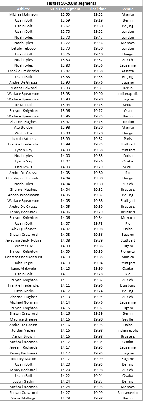 One thing that stands out is that Usain Bolt was at least 0.10 seconds faster than the median result during every 50m segment in his two best races of 19.19 and 19.30. In his 19.19 performance Bolt was in fact between 0.12 and 0.18 seconds faster than the median during every 50m segment. No other sprinter in history has been that outstanding during every part of the race and in order to break the 19.19 record I believe that the sprinter in question will have to master every part of the race to a similar degree as Bolt did at his peak. To take an example of this I would point out that Michael Johnson in his 19.32 race was 0.13s (50-100m), 0.16s (100-150m) and 0.23s (150-200m) faster than the median results and still significantly behind the 19.19 mark due to being slightly slower than the median result over the first 50m segment. So even if Bolt clearly was showing signs of fatigue during the last 50 metres of his 19.19 race the first 50m segment of Johnson was a far more significant weakness than the last 50m segment of peak Bolt was. Most sprinters have to sacrifice some time during either the 0-50m segment or the 150-200m segment. If you run the first 50 metres hard that will likely catch up to you to a certain degree during the last 50 metres and if you on the other hand hold back much during the first 50 metres that lost time will be very difficult to recover later in the race. An example of this is that outside of Bolt none of the sprinters that have run a sub-5.7 first 50m segment (Gatlin, Norman and Gay) have also run a sub-4.97 last 50m segment in the same race as their sub-5.7. With this in mind it is pretty amazing that Bolt at his peak managed to be at least 0.12 seconds faster than the median during every 50m segment.